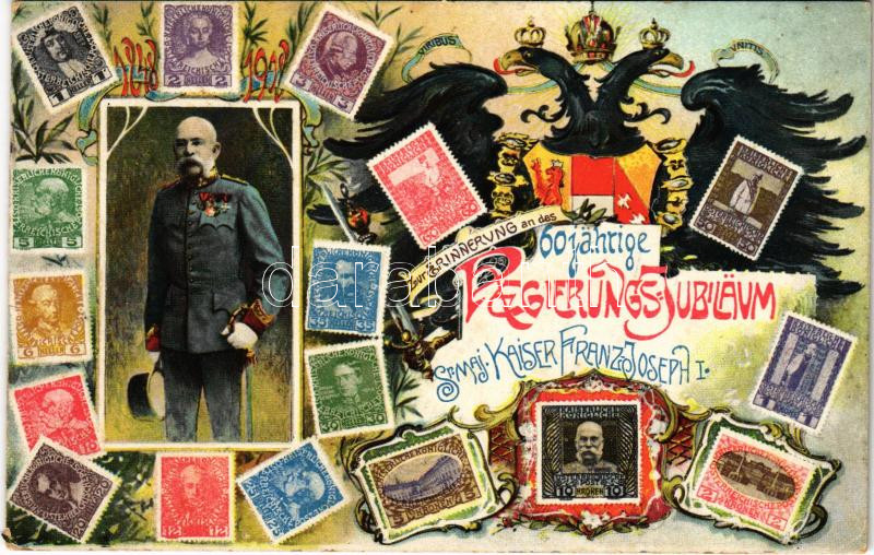 1848-1908 Zur Erinnerung an das 60 jährige Regierungs-Jubiläum Sr. Majestät Kaiser Franz Joseph I / Ferenc József uralkodásának 60. évordulója alkalmából kiadott jubileumi művészlap / Franz Joseph I of Austria 60th anniversary of reign art postcard with coat of arms and stamps, Viribus Unitis propaganda, stamps. Art Nouveau (EK)