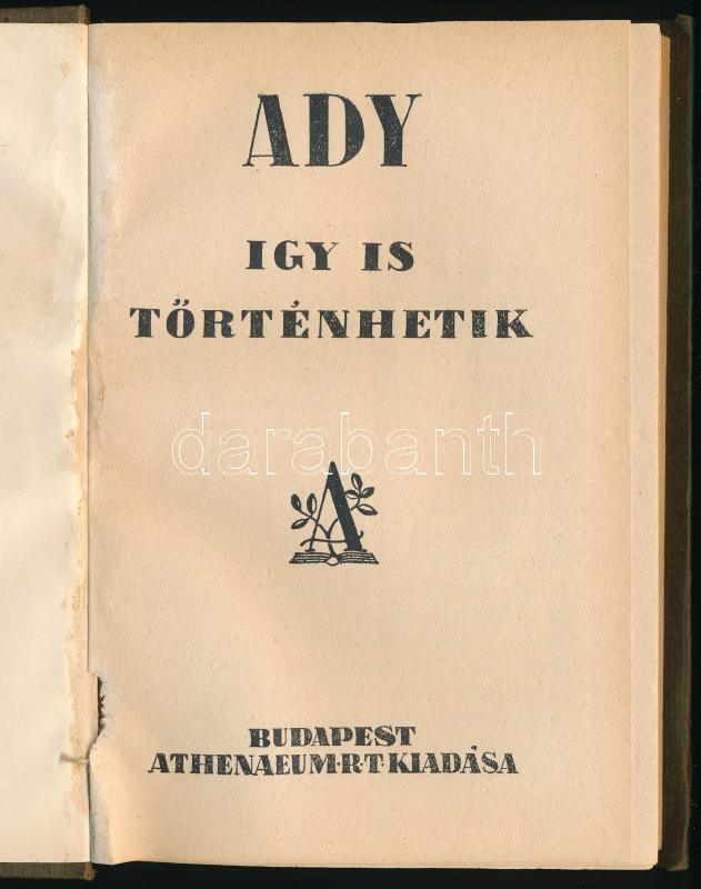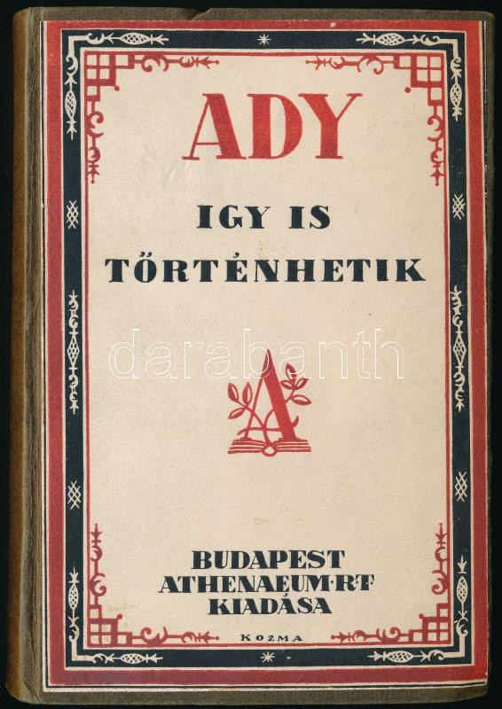 Ady Endre: Így is történhetik. Bp.,(1925), Athenaeum. A bekötött papírborító Kozma Lajos (1884-1948) munkája. Későbbi kartonált papírkötés, az eredeti papírborító a borítóra ragasztva, címlapon kisebb sérüléssel.