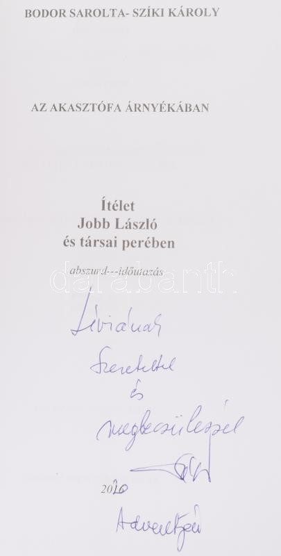 Bodor Sarolta - Szíki Károly: Az akasztófa árnyékában. Ítélet Jobb László és társai perében. Abszurd --- időutazás. Szíki Károly fotóival. Az egyik szerző, Szíki Károly (1954-) színész, rendező, fotográfus által Mohás Lívia (1928-2024) pszichológus, József Attila-díjas írónak DEDIKÁLT példány! Eger, 2016, 4 Pont Nyomda Kft. Készült az 1956-os Emlékbizottság megbízásából. Kiadói papírkötés.