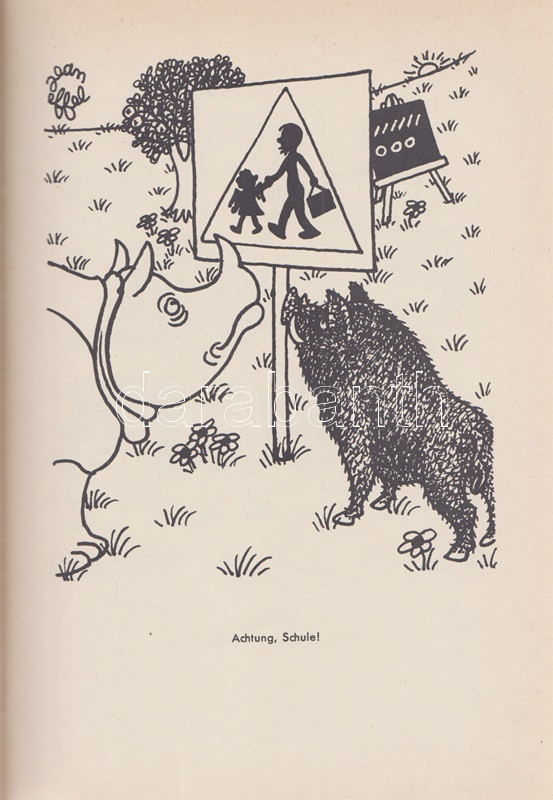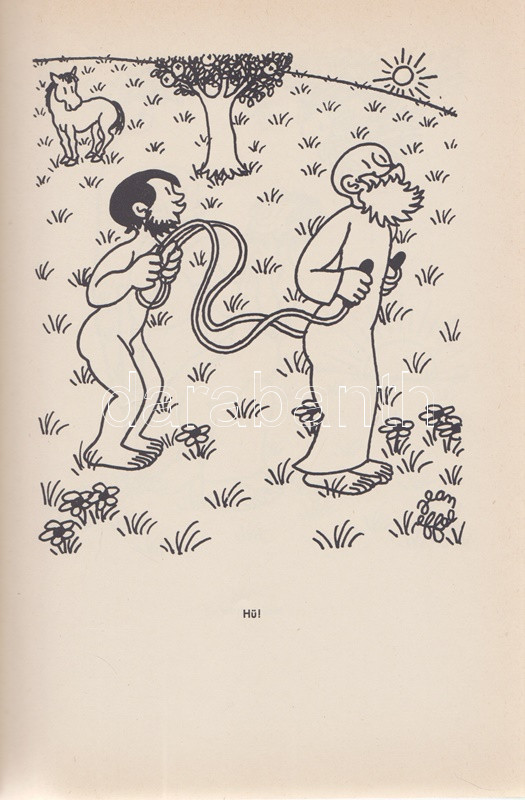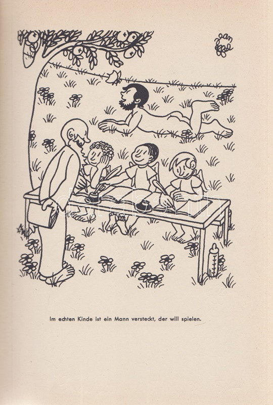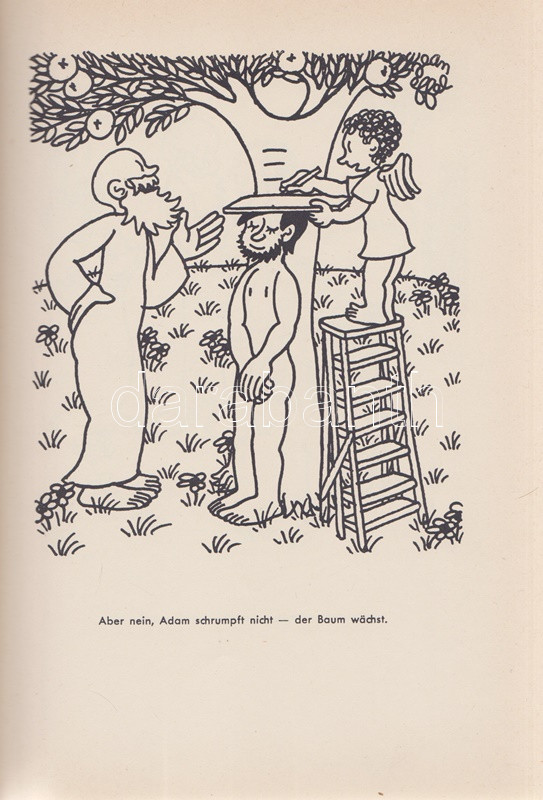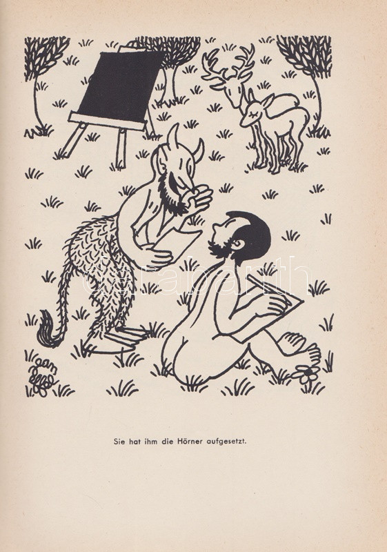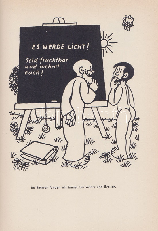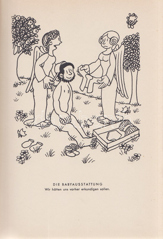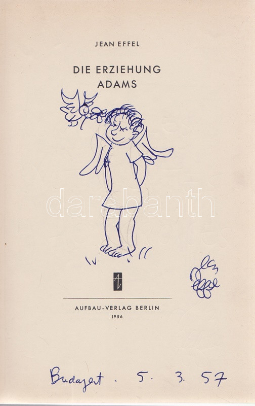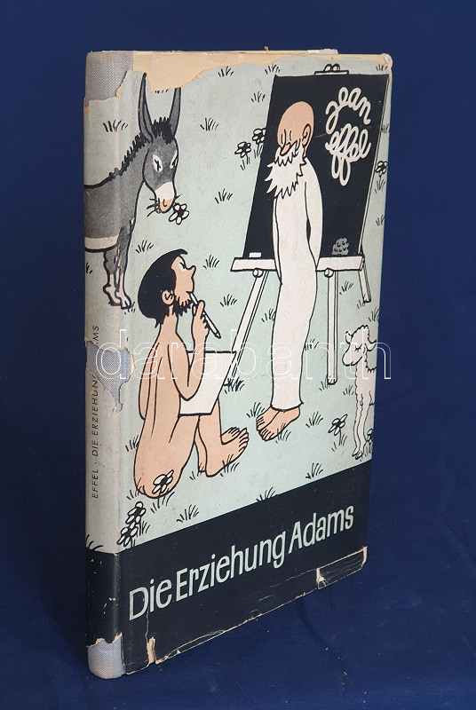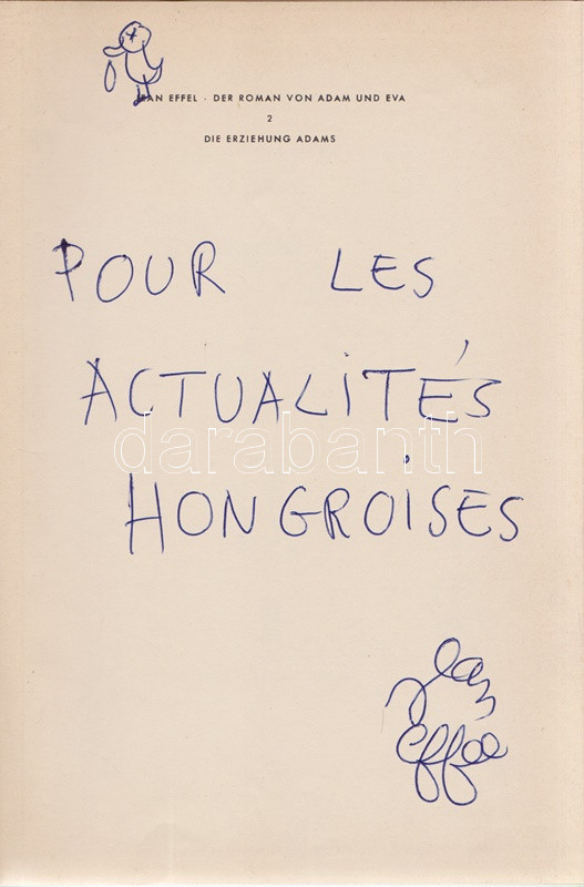 Effel, Jean: Die Erziehung Adams. (Jean Effel rajzos dedikációival.) Berlin, 1956. Aufbau-Verlag (Druck: Fr. Richter, Leipzig). [4] p. + 80 t. A címoldalon Jean Effel grafikusművész angyalt ábrázoló saját kezű rajzával és dátumozott aláírásával: Jean Effel, Budapest, 5. 3. 57", a szennycímoldalon madárrajzzal kiegészített francia nyelvű, aláírt dedikációjával: ,,Pour les acualités hongroises: Jean Effel". A táblákon Jean Effel ,,Ádám naplójából" című sorozatának rajzai, Ádámnak Éva teremtése előtti napjaiból. Jean Effel (1908-1982) francia karikaturista, baloldali érzelmű művész korábban számos munkái közt előzőleg La Fontaine meséihez rajzolt illusztrációkat. A vasfüggöny mögötti világ több díját elnyerő Jean Effel vidám kötete eredeti nyelven először 1954-ben jelent meg, ,,L'école paternelle" címmel, rajzaiból 1957 márciusában nyílt kiállítás Budapesten. Kötetünk dedikációja is ez alkalommal készült. (Der Roman von Adam und Eva. Vol. 2.) Kiadói félvászon kötésben, színes, illusztrált, enyhén sérült kiadói papírborítóban, felül színes festésű lapszélekkel. Jó példány.