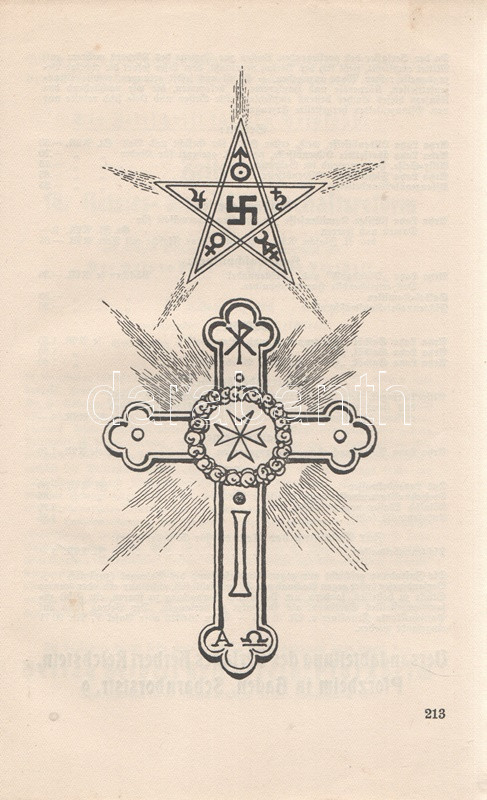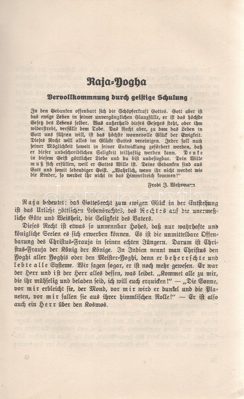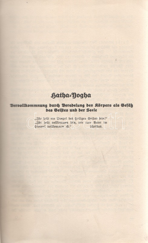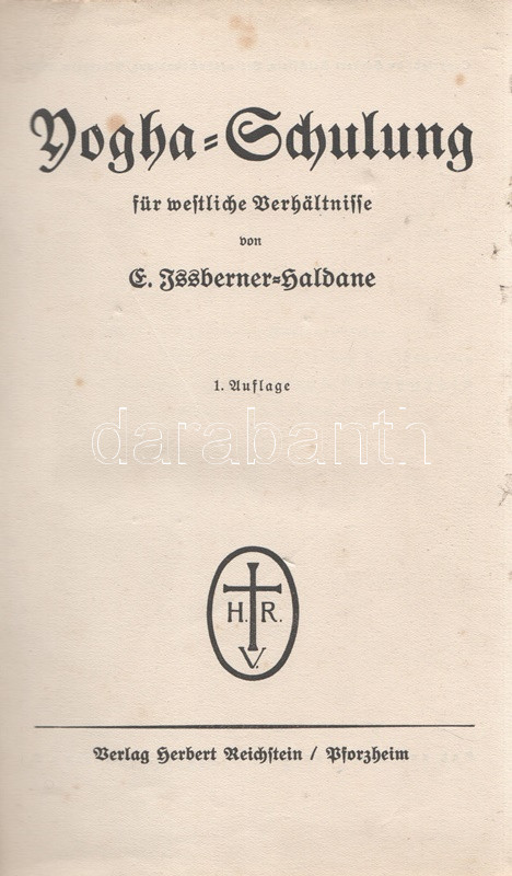 Issberner-Haldane, E[rnst]: Yogha-Schulung für westliche Verhältnisse. Pforzheim, (1928). Verlag Herbert Reichstein (Druck von Wilhelm Langguth, Esslingen). 1 t. (címkép) + 213 + [7] p. Ernst Issberner-Haldane (1886-1966) okkult szerző a kereskedősegédekből lett misztikusok, tenyérjósok és ezoterikus írók számát gyarapítja. Tervezett ausztráliai kivándorlása megvalósítása közben a brit Indiában, Ceylonban jógikkal ismerkedett meg, majd ausztrál korszaka után állítólagos perui útja során misztikus bölcsekkel való kapcsolatfelvétele útján elmélyültek főként tenyérjóslásra vonatkozó ezoterikus ismeretei. Az első világháborút követően tenyérjósként és kéz-diagnosztaként helyezkedett el Berlinben, illetve a divatba jövő jóga különféle módjait ismertette. 1920 környékén csatlakozott a rasszista és antiszemita alapokon nyugvó ezoterikus tanítás, az arioszofia mozgalomhoz. Az oldalszámozáson belül egész oldalas és szövegközti illusztációkkal kísért jóga-értekezés illusztrációi között felbukkanó szvasztika-motívumok valójában nem meglepőek, az árja-nyugati faj számára írt jógaismertető kézikönyvét ugyanis kimondottan árják számára írta, és azt is vallotta, hogy a jóga gyakorlata csak az általa felsőbbrendűnek tartott fajok számára való. Egyértelmű nemzetiszocialista szimpátiája ellenére műveit a náci rezsim - más, szabadkőműves és egyéb felforgatónak ítélt munkák társaságában - betiltotta, szerzője pedig koncentrációs táborba került. A második világháborút követően egyes művei - döntően kéz-diagnosztikai és tenyérjóslási könyvei újra forgalomba kerültek, markánsan ideologikus jóga-műve érthető módon kimaradt az újrakiadásból. A címoldalon és néhány oldalon halvány foltosság, az első előzéken könyvkötői könyvjegy. Korabeli egészvászon kötésben (Kiss József Ferenc, Budapest), az alsó lapszéleken apró foltosság. Jó példány.