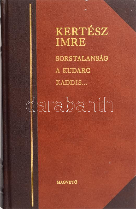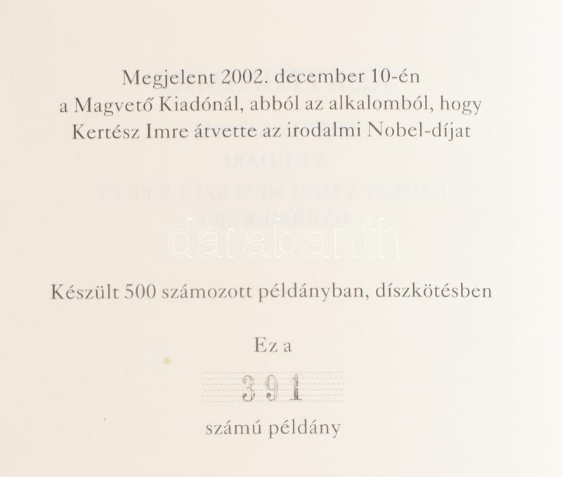 Számozott (391./500) példány. "Megjelent 2002. december 10-én a Megvető Kiadónál, abból az alkalomból, hogy Kertész Imre átvette az irodalmi Nobel-díjat."