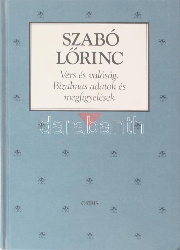 Szabó Lőrinc: Vers és valóság. Bizalmas adatok és megfigyelések. Bp., ... https://www.darabanth.com/hu/469-Gyorsarveres/469.0/Konyvek/Konyvek-Egyeb-ritkasagok~2000025/Szabo-Lorinc-Vers-es-valosag-Bizalmas-adatok-es-megfigyelesek-Bp-2001-Osiris-Kiadoi-k~II3156377