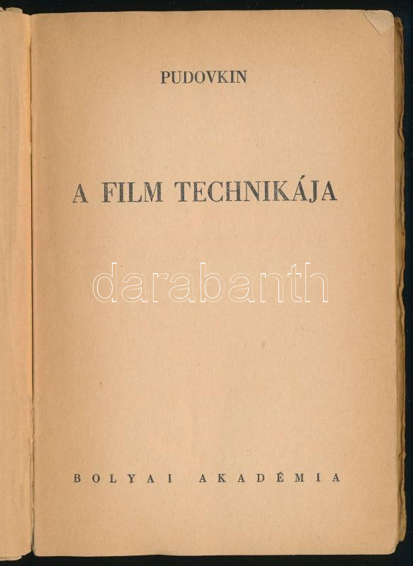 Pudovkin, [Vszevolod Illarionovics]: A film technikája. Ford.: Dr. Székely György, Jenei Imre. Bolyai Könyvek. Bp., 1944, Bolyai Akadémia, 144 p. Kiadói papírkötés, kissé sérült, foltos borítóval.