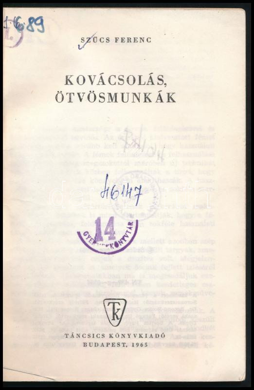 Leírás: Szűcs Ferenc: Kovácsolás, ötvösmunkák. Bp., 1965, Táncsics. Kiadói papírkötés, javított gerinc, kopottas állapotban, volt könyvtári példány.