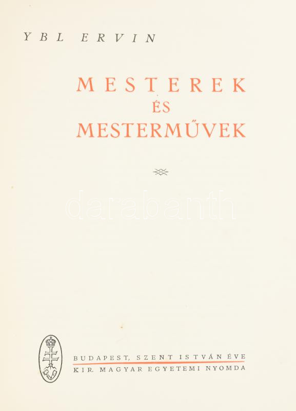 Ybl Ervin: Mesterek és mesterművek. Bp.,1938, Kir. M. Egyetemi Nyomda....
