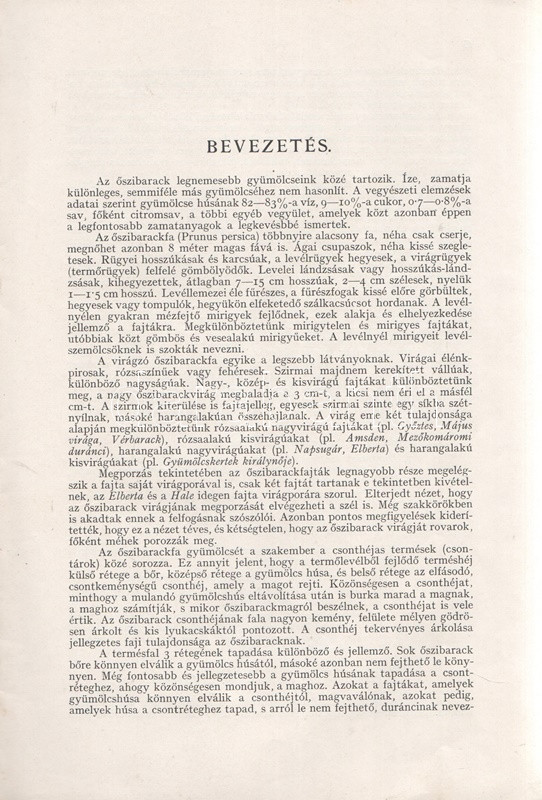 A gyümölcstermesztők számára készült pomológiai szakmunka az őszibarackfajták 40 típusát ismerteti. A sorozat tervbe vette az őszibarackfajtákat ismertető második szakmunkát is, ez azonban tudomásunk szerint nem jelent meg. Az ismeretterjesztő füzetet 45, magában álló, színes tábla kíséri, ebből 35 tábla a füzetben ismertetett nemesítéseket ábrázolja. Példányunk címlapja sérült.