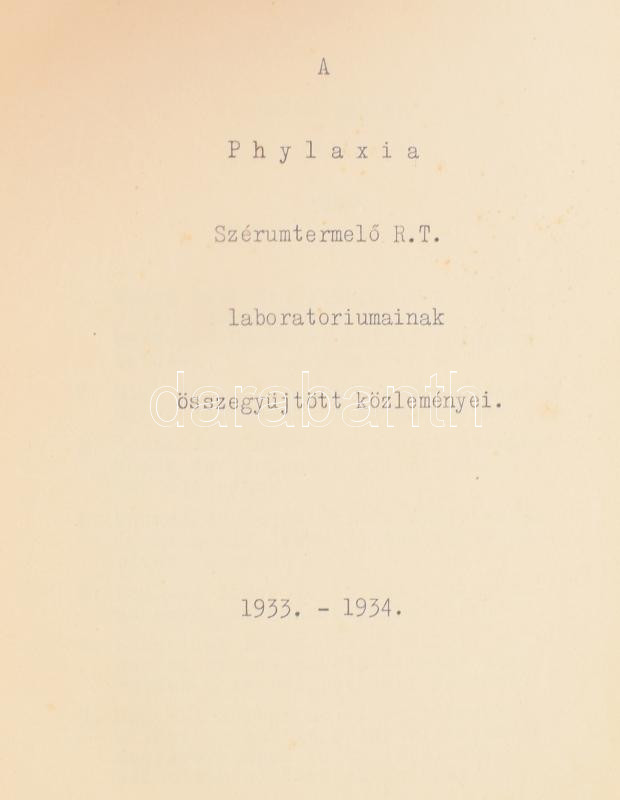 Phylaxia Szérumtermelő Rt. laboratóriumainak összegyűjtött közleményei... https://www.darabanth.com/hu/469-Gyorsarveres/469.0/Konyvek/Konyvek-Termeszettudomany-medicina~1000025/Phylaxia-Szerumtermelo-Rt-laboratoriumainak-osszegyujtott-kozlemenyei-1933-1934-Kulonle~II3175902