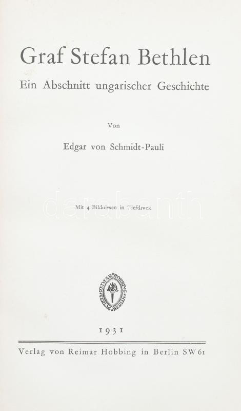 Schmidt-Pauli, Edgar von: Graf Stefan Bethlen. Ein Abschnitt ungarischer Geschichte. Berlin, 1931, Reimar Hobbing, 1 (címkép, gróf Bethlen István portréja) t.+ 298+(2) p.+ 3 (Tisza István, Apponyi Albert és Horthy Miklós portréi) t. Német nyelven. Kiadói egészvászon-kötés, kissé koszos borítóval, belül nagyrészt jó állapotban, néhány kissé foltos lappal.