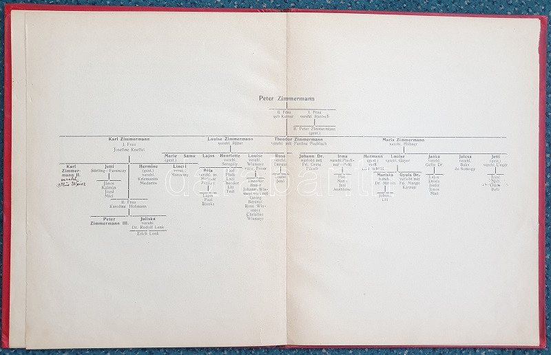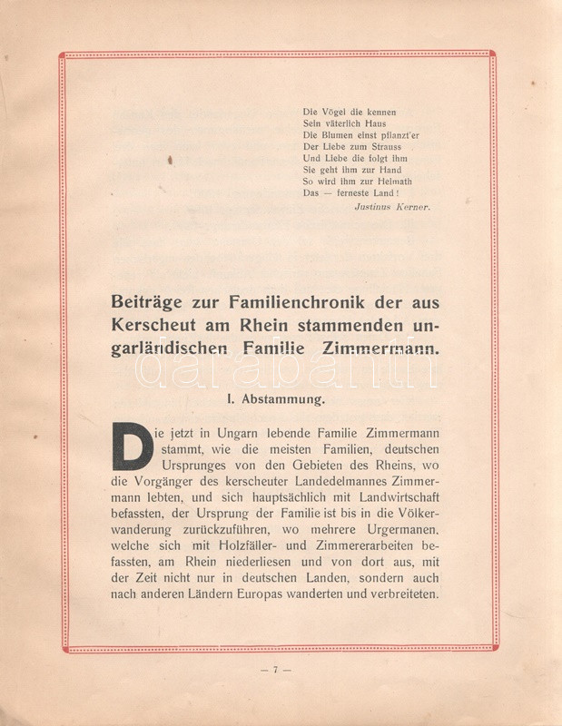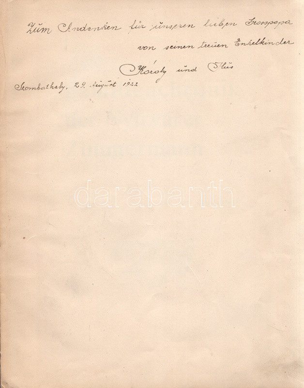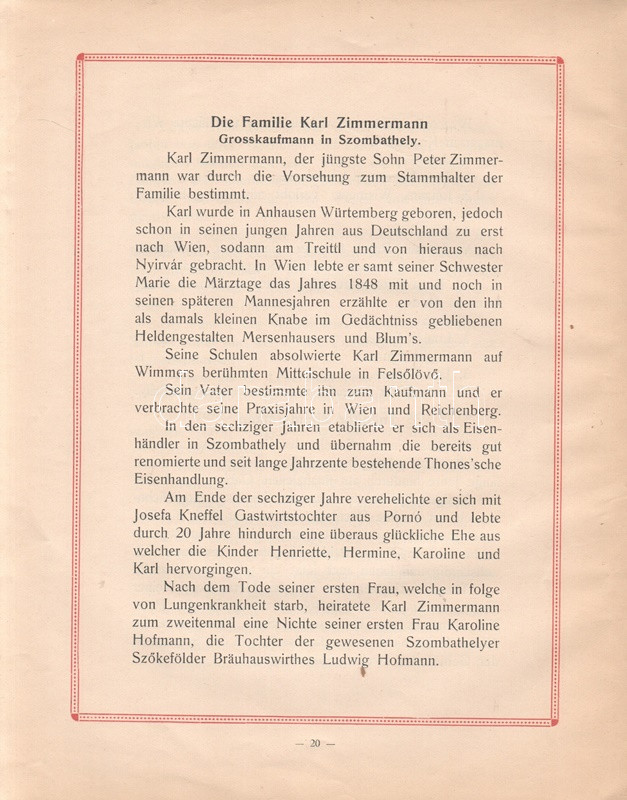 Dedikált: ,,Zum Andenken für unseren lieben Grosspapa von seinen treuen Enkelkinder Károly und Ilus. Szombathely, 29. August 1922". A keretdíszes szövegoldalakkal ellátott kiadvány a Vas megyei kereskedőcsalád, a Zimmermannok történetét dolgozza ki. A kötet vázolja a magyarországi német bevándorlás három nagy hullámát, a frankok 1200, a szászok 1600 (?), a svábok 1800 (?) körüli országba érkezését. A Zimmermann család az utolsó német hullámmal érkezett Vas vármegyébe.