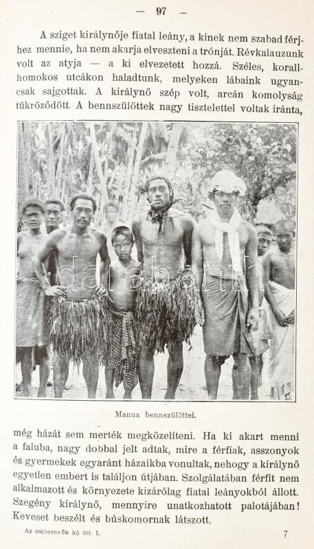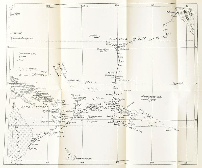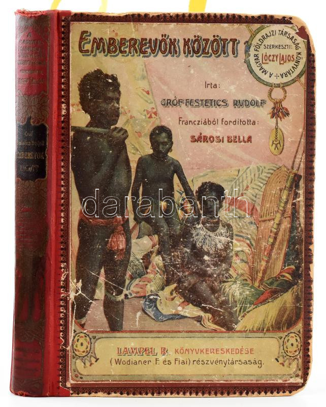 Festetics Rudolf (1865-1943): Emberevők között. Nyolcévi Csendes-óceáni hajózás a "Tolna" yachton. 55 képpel és 1 térképpel. Fordította: Sárosi Bella. Magyar Földrajzi Társaság Könyvtára. Bp.,[191?],Lampel R. (Wodianer F. és Fiai) Rt., 1 t.+4+278+1 p.+ 1 (kihajtható térkép) t. 2. kiadás. Az oldalszámozáson belül szövegközti és egészoldalas fekete-fehér fotókkal illusztrált. Kiadói illusztrált félvászon-kötés, kopott borítóval, az elülső tábla sarkain és felső szélén sérülésekkel, az elülső tábla belsején a papíron kis hiánnyal, de ezt leszámítva belül jó állapotban.