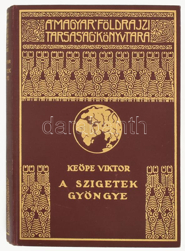 Keöpe Viktor: A szigetek gyöngye. 53 képpel és 2 térképpel. Budapest, (1936). Franklin-Társulat Magyar Irodalmi Intézet és Könyvnyomda. 189 + [3] p. + 20 t. (kétoldalas) + 1 térkép (kihajtható). Egyetlen kiadás. (A Magyar Földrajzi Társaság könyvtára.) Festett, aranyozott kiadói egészvászon kötésben, gerince kissé kopott.