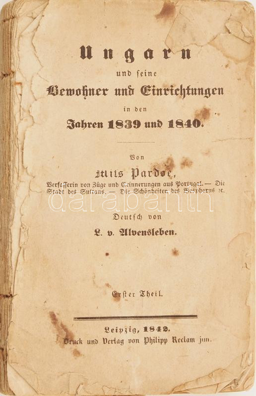 Leipzig, 1842. Reclam. IV+226; Fűzve, korabeli sérült papÃrborÃtóval. Julia Pardoe (1806-1862) angol ÃrónÅ‘. Több érdekes úti beszámolót Ãrt, Magyarországgal több műben is foglalkozott. Egy két lap sérült.