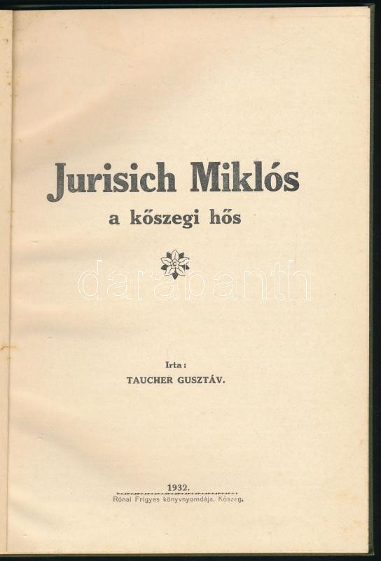 Taucher Gusztáv: Jurisich Miklós, a kőszegi hős. Kőszeg, 1932, Rónai F... https://www.darabanth.com/hu/469-Gyorsarveres/469.0/Konyvek/Konyvek-Utazas-helytortenet~1000017/Taucher-Gusztav-Jurisich-Miklos-a-koszegi-hos-Koszeg-1932-Ronai-Frigyes-32-p-Aranyozott~II3152048
