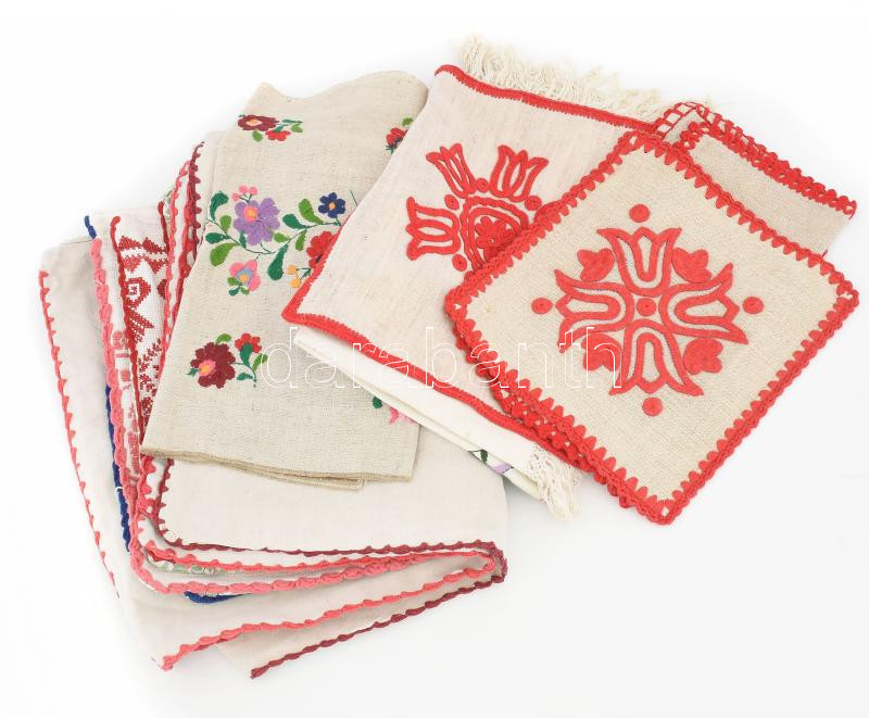 Leírás: 10 db Kalocsai mintás párnahuzat, kis terítő, kendő, hímzett, kézimunka.