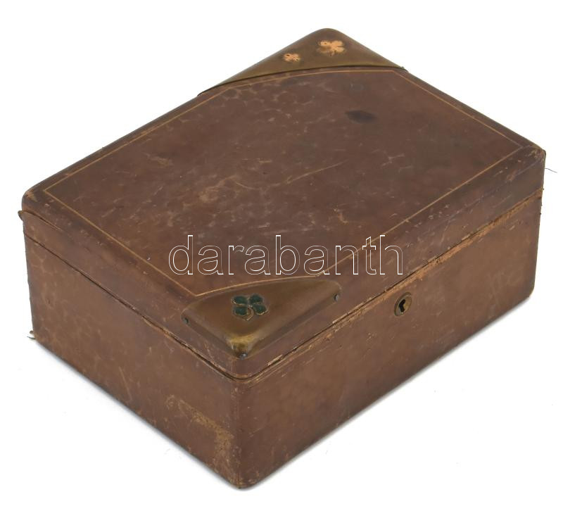 Leírás: Antik, lóherés ládika, kulccsal. Két dísz hiányzik, belül kissé szakadozott a bélés 15x21 cm