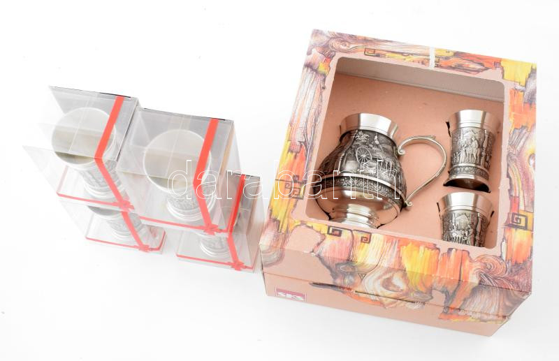 Leírás: Historizáló jelenetes ón kancsó 6 pohárral, eredeti csomagolásában.