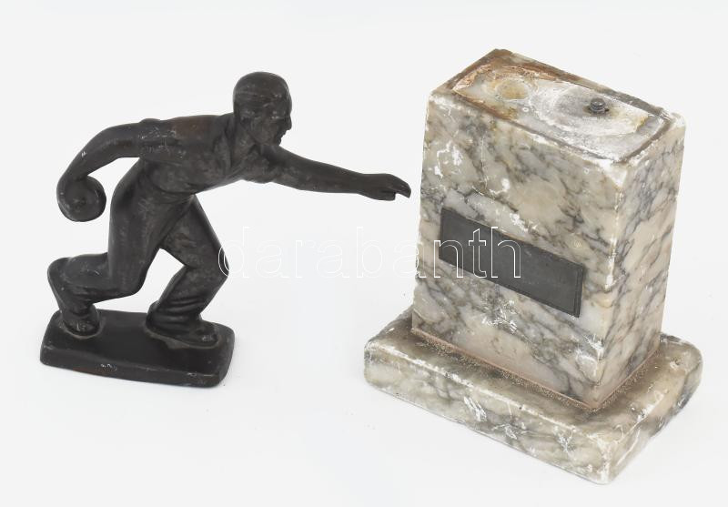 Leírás: Petanque játékos alakjával díszített díj, 1951, márvány talapzaton, melyre nincs rögzítve. Ón, márvány, teljes m: 22 cm