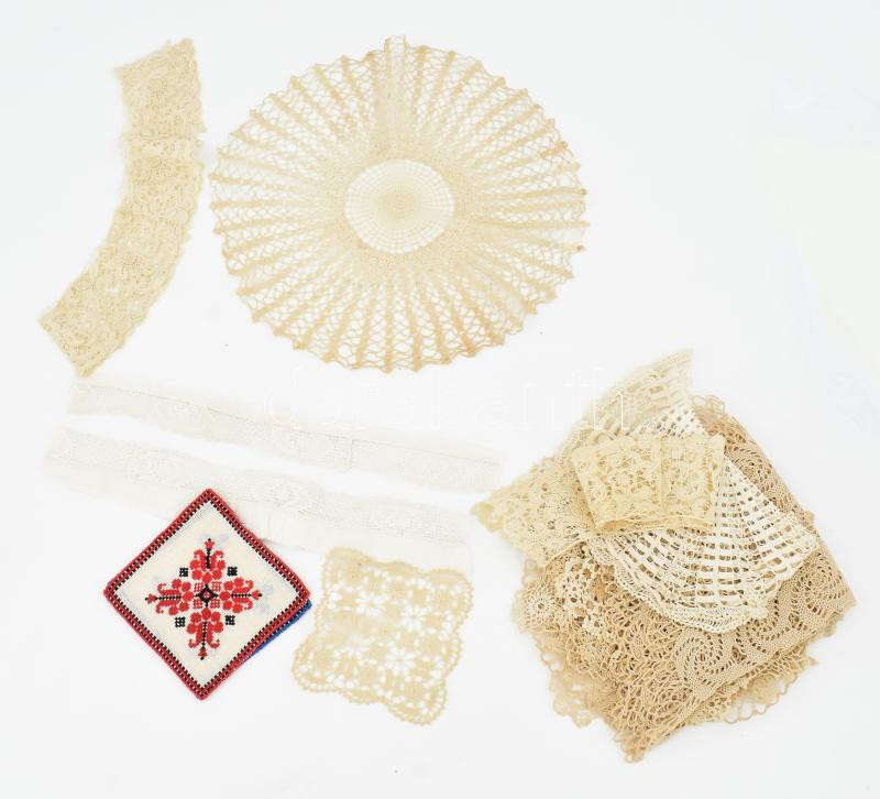 Leírás: Vegyes csipke terítők kis méretben 14 db közötte hímzett, hozzá két ruha dísz