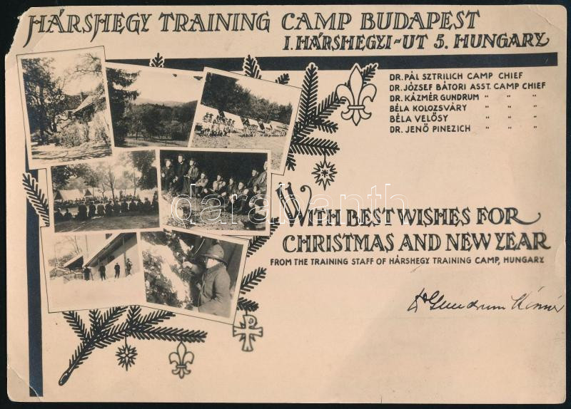 cca 1930 Hárshegy Training Camp Budapest, I. Hárshegyi-ut 5., Hungary - With Best Wishes for Christmas and New Year from the Training Staff / A Hárshegyi Cserkészpark (alapította Sztrilich Pál 1927-ben) vezetőképző táborának angol nyelvű karácsonyi-újévi üdvözlőlapja, rajta Gundrum Kázmér (1907-1991), a Magyar Cserkészszövetség főtitkárának aláírásával, kis sarokhiánnyal, 16,5x11,5 cm