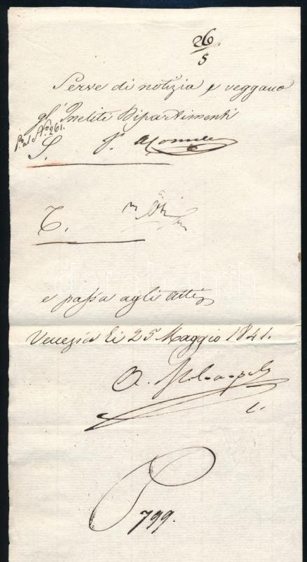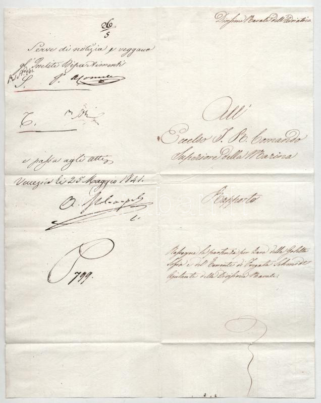 1841 A Haditengerészet FÅ‘parancsnokságához intézett olasz nyelvű jelentés borÃtója az S.M.S.Sofia indulásáról. A hajó Schmidt hadnagy vezetésével Zárába tart. Az elismervény aláÃrása Velencében, / Folded cover of a report in Italian to the High Command of the Navy on the departure of S.M.S. Sofia under Fregattenleutnant Schmidt bound for Zara. Acknowledgement signed in Venice, May 25, 1841.