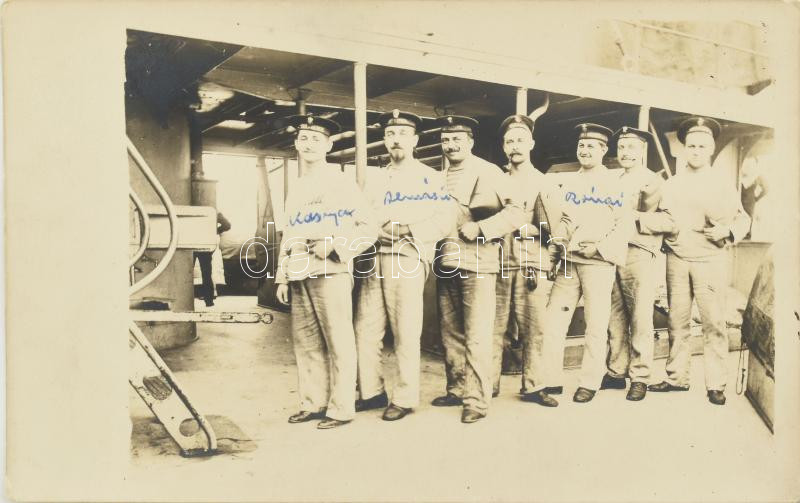 1915 Az S.M.S. Babenberg osztrák-magyar hadihajó matrózai (rezervista önkéntesei) aludni készülnek fotólap. / Seven members of the crew of S.M.S. Babenberg, reservists, according to the writing in Hungarian on the back, carry pillows and blankets as they prepare to hit the hammock. Black-and-white photo postcard