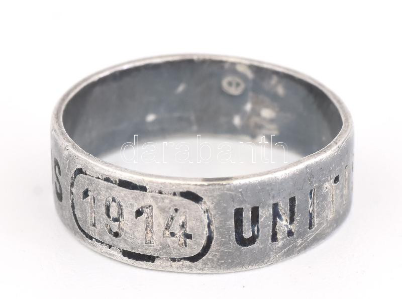 Ezüst(Ag) I. világháborús gyűrű, jelzett, méret: 50, nettó: 2,4 g https://www.darabanth.com/hu/469-Gyorsarveres/469.0/Mutargy-papirregiseg-egyeb/Militaria~2000024/EzustAg-I-vilaghaborus-gyuru-jelzett-meret-50-netto-2-4-g~II3152691
