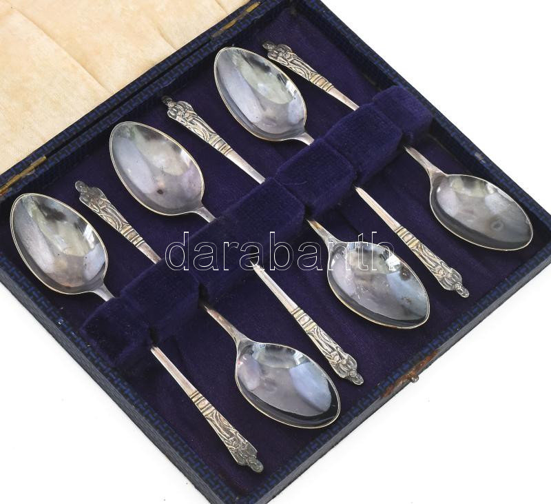 Leírás: Antik ezüstözött kanál készlet, vallásos figurális ábrázolással, dobozában, h: 11,5 cm