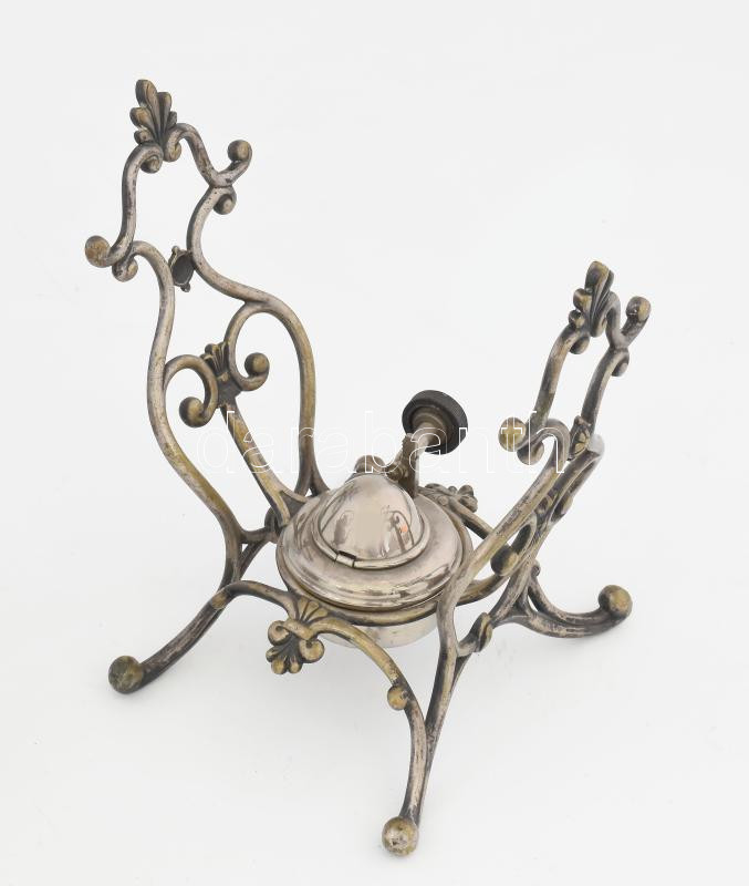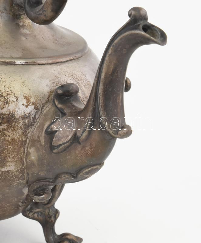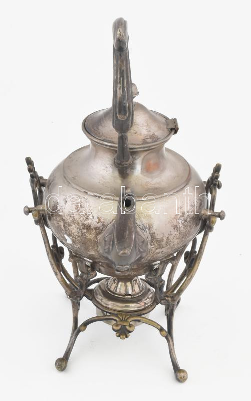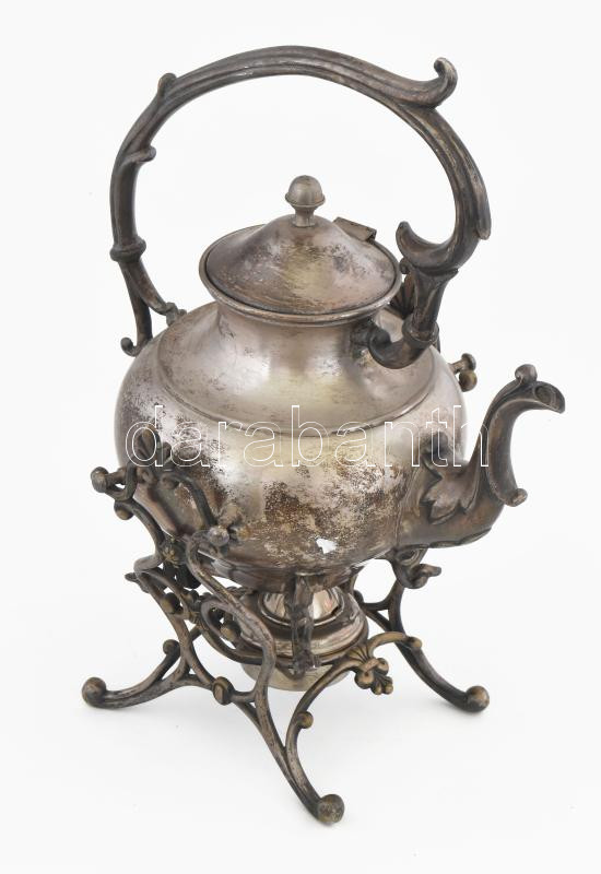 Leírás: Antik ezüstözött réz szamovár, tartóval, borszeszégővel, kopott, m: 34,5 cm