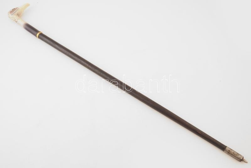 Leírás: Kacsafej figurával díszített túrabot, feketére pácolt fa, rézgyűrűvel, h: 93 cm