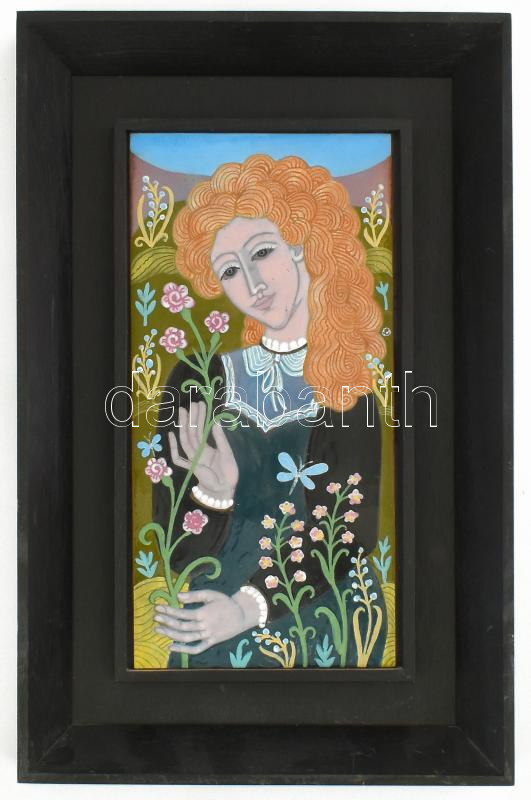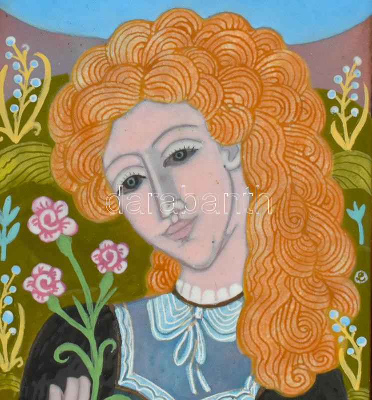 Leírás: Stefániay Edit (1936-2010): Lány virággal. Tűzzománc, réz lemezen. Hátoldalán címkén feliratozott. Fakeretben, 30x15 cm