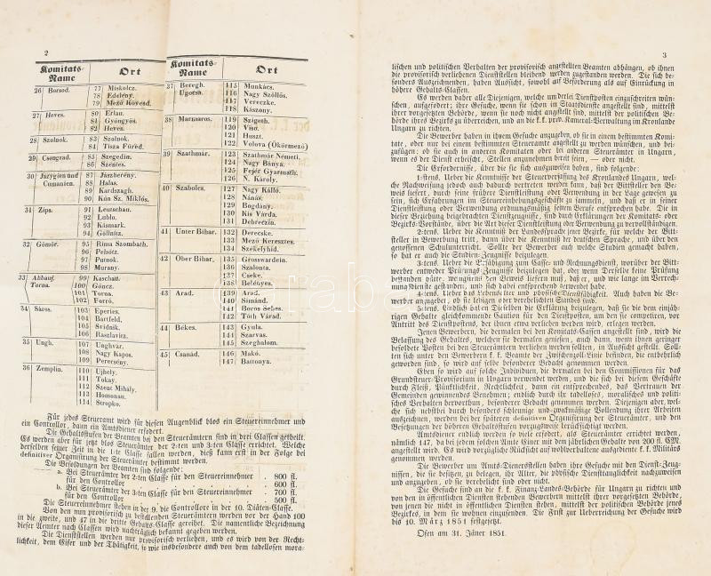 Leírás: 1851 Buda, német nyelvű adóhirdetmény