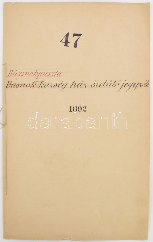 1892 Dusnokpuszta dűlőinek jegyzéke 1p. Papírborítóval https://www.darabanth.com/hu/469-Gyorsarveres/469.0/Mutargy-papirregiseg-egyeb/Nyomtatvanyok~1000014/1892-Dusnokpuszta-duloinek-jegyzeke-1p-Papirboritoval~II3140352