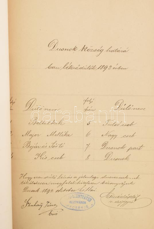 Leírás: 1892 Dusnokpuszta dűlőinek jegyzéke 1p. Papírborítóval