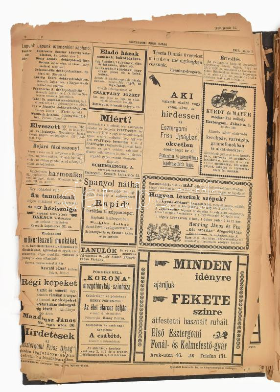 1919 Esztergomi Friss Ujság politikai napilap 56 db száma, 1919. január-október, benne többek közt a cseh megszállással kapcsolatos hírekkel, sérült lapszélekkel