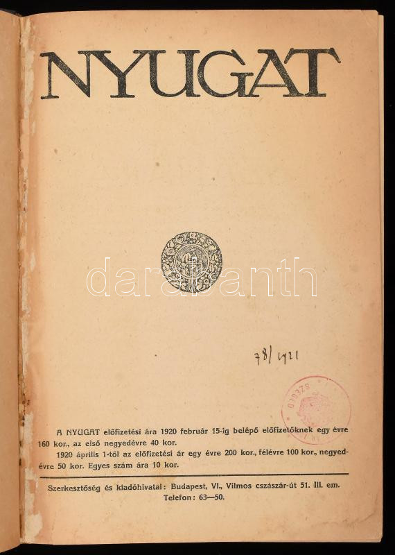 1920 A Nyugat 3 db kettős száma egybekötve: XIII. évf. 1-2., 3-4., 5-6...