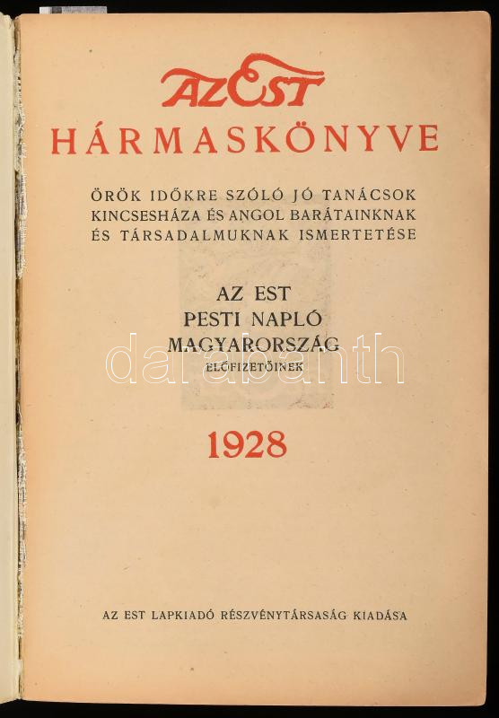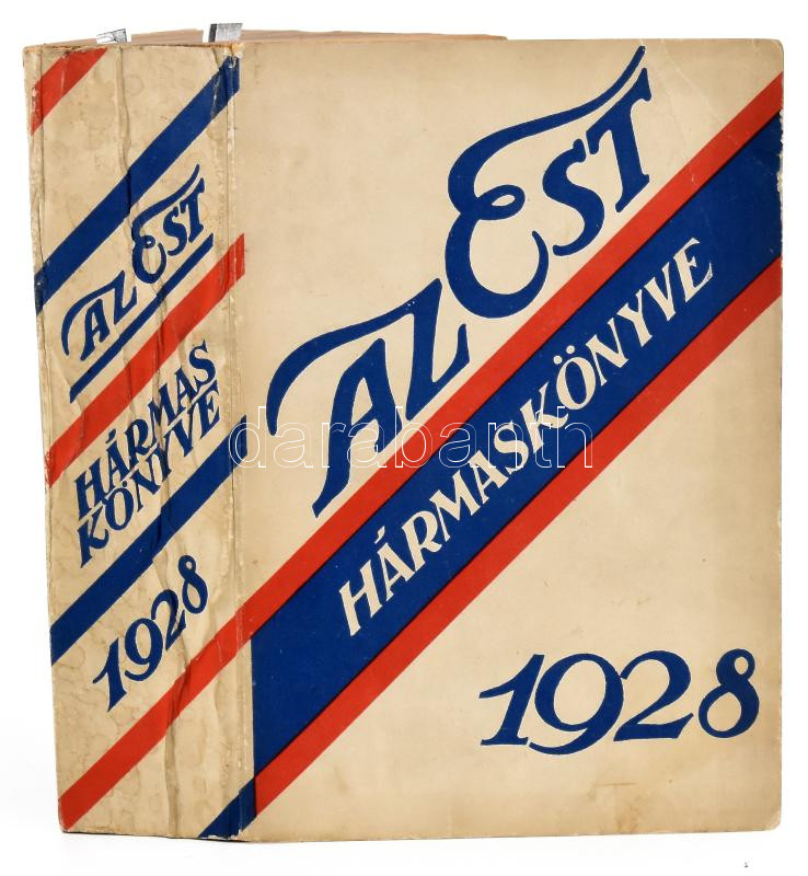 1928 Az Est Hármaskönyve, kiadói papírkötésben, kissé kopottas állapot... https://www.darabanth.com/hu/469-Gyorsarveres/469.0/Mutargy-papirregiseg-egyeb/Nyomtatvanyok~1000014/1928-Az-Est-Harmaskonyve-kiadoi-papirkotesben-kisse-kopottas-allapotban~II3176306