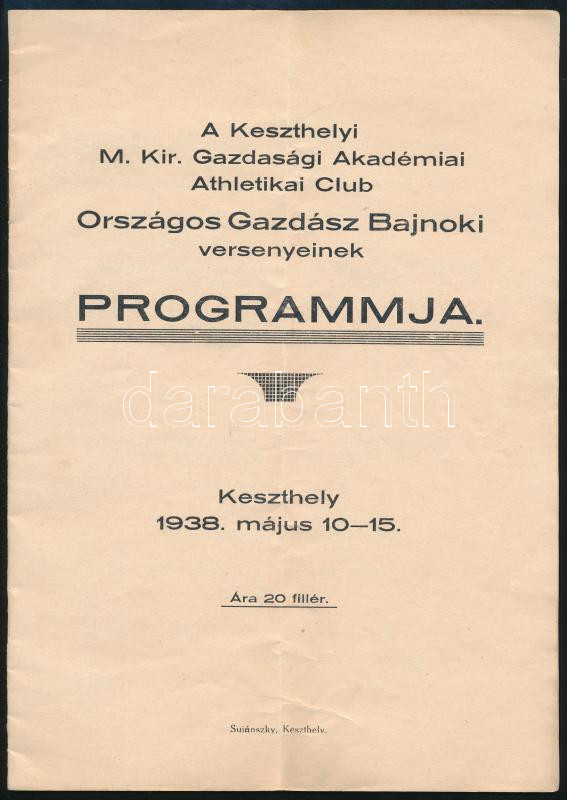 1938 A Keszthelyi M. Kir. Gazdasági Akadémiai Athletikai Club Országos... https://www.darabanth.com/hu/469-Gyorsarveres/469.0/Mutargy-papirregiseg-egyeb/Nyomtatvanyok~1000014/1938-A-Keszthelyi-M-Kir-Gazdasagi-Akademiai-Athletikai-Club-Orszagos-Gazdasz-Bajnoki-versenyei~II3132839
