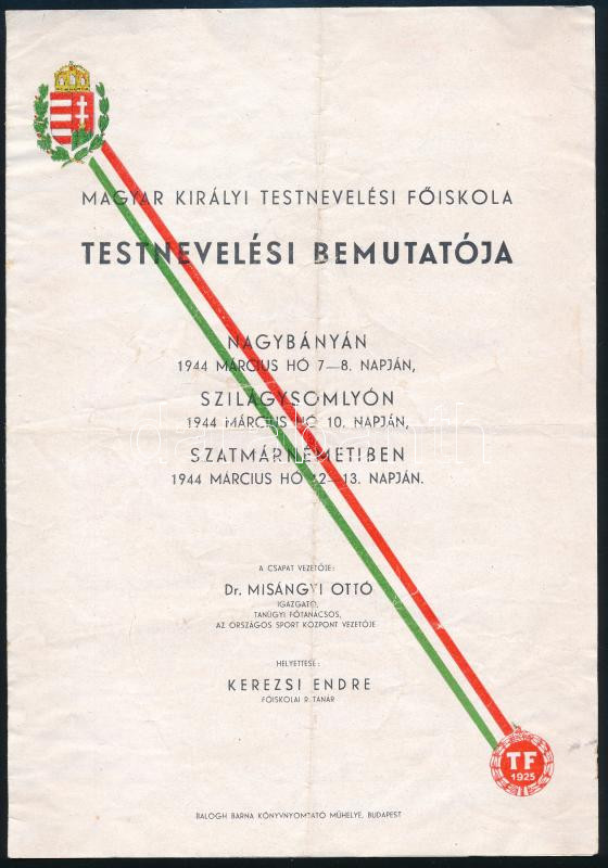 1943 A Magyar Királyi Testnevelési Főiskola testnevelési bemutatója Na... https://www.darabanth.com/hu/469-Gyorsarveres/469.0/Mutargy-papirregiseg-egyeb/Nyomtatvanyok~1000014/1943-A-Magyar-Kiralyi-Testnevelesi-Foiskola-testnevelesi-bemutatoja-Nagybanyan-Szilagysomly~II3175519