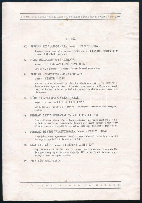 Leírás: 1943 A Magyar Királyi Testnevelési Főiskola testnevelési bemutatója Nagybányán, Szilágysomlyón, Szatmárnémetiben, műsorfüzet, hajtott