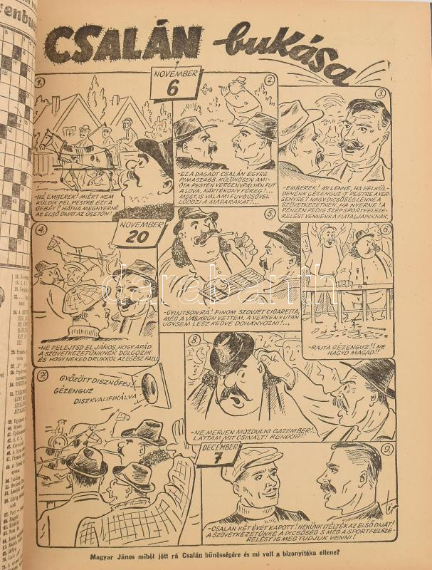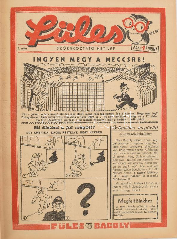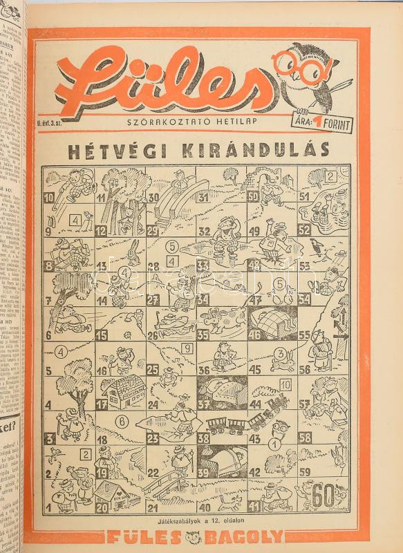 1949-1950 Füles szórakoztató hetilap első két évfolyamának egybekötött számai: I. évf. 1-11. sz. + II. évf. 1-24. sz. Félvászon-kötésben, helyenként kissé sérült lapokkal.