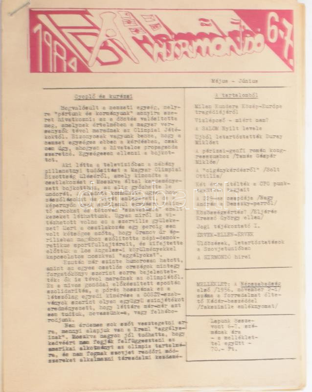 1984 AB Hírmondó c. szamizdat kiadvány 1984. május-júniusi 4. száma, benne többek közt Solt Ottilia írásával, a CPG tagok elitéléséről, a Demszky-perről. 78p.