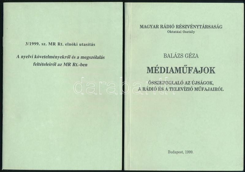 1999 Balázs Géza: Médiaműfajok. Összefoglaló az újságok, a rádió és a televÃzió műfajairól. Bp., 1999, Magyar Rádió Rt. Oktatási Osztály, 62 p. + 3/1999. sz. MR Rt. elnöki utasÃtás. A nyelvi követelményekrÅ‘l és a megszólalás feltételeirÅ‘l az MR Rt.-ben. Kiadói tűzött papÃrkötés.