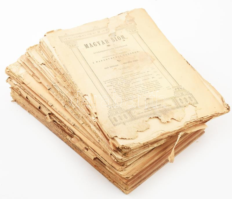 Magyar Sion. Egyházirodalmi folyóirat. Első évi folyam. szerkesztik és kiadják: a papneveldei tanárok. Első évfolyam: március, június, október, . Második évfolyam február, novenber, harmadik évfolyam 7., 8., . Negyedik évfolyam 1., 5., 12., Myolcadik évf. 7. 9., IX. évf 5., 10., 11., 12., XV. évf 12. XVIII. évf 5. füzetek Esztergom, 1887-1904 Horák Egyed, Buzárovits. Kiadói papíborítóval, vegyes állapot, főleg az első számok rosszz állapotban.