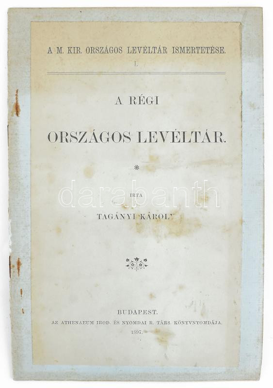 Tagányi Károly: A régi országos levéltár. Bp., 1897. Athenaeum 12p. Pa... https://www.darabanth.com/hu/469-Gyorsarveres/469.0/Mutargy-papirregiseg-egyeb/Nyomtatvanyok~1000014/Taganyi-Karoly-A-regi-orszagos-leveltar-Bp-1897-Athenaeum-12p-Papirkotesben~II3152855