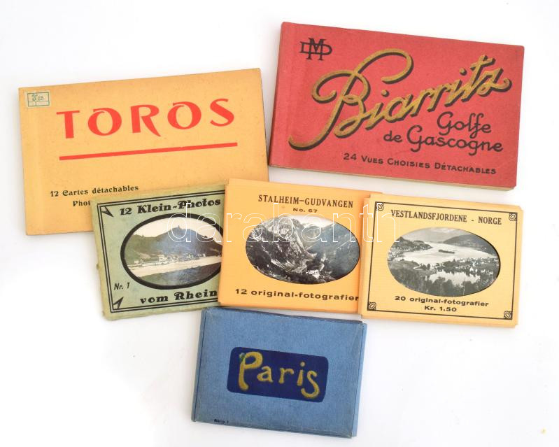 Leírás: cca 1920-1940 Vegyes idegenforgalmi tétel, 6 db, képeslap leporellók, fényképes szuvenírek...stb. Közte Stalheim - Gudvangen, Vestlandsfjordene (Norvégia), Biarritz, Rhein (Németország), Paris (Franciaország), Toros (Spanyol bikaviadalok.)