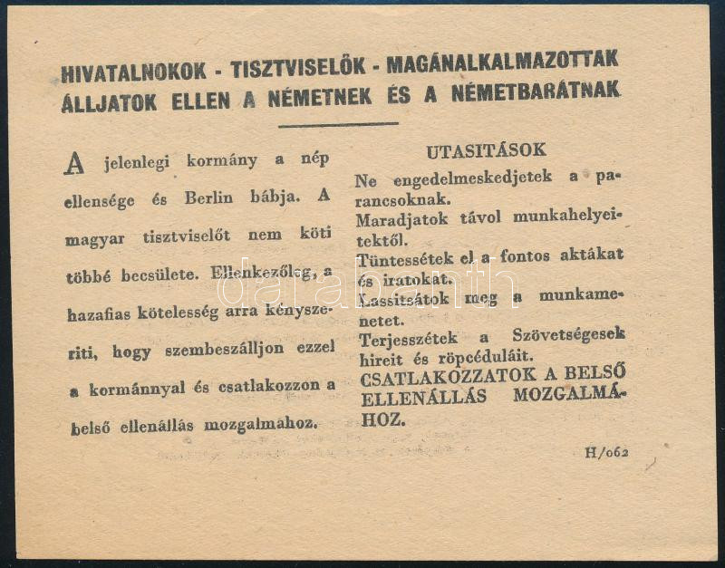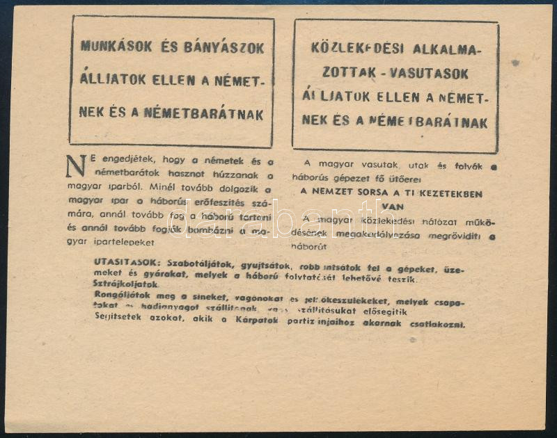 cca 1944, "Álljatok ellen a németnek és németbarátnak", II. világháborús, hivatalnokokat, tisztviselőket, magánalkalmazottakat, munkásokat, bányászokat, vasutasokat stb. megszólító németellenes röplap, kétoldalas, 10x12,5 cm