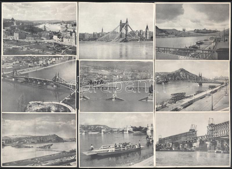Leírás: cca 1946-1950 Budapest hídjai a II. világháború után, 9 db fekete-fehér kép, 13,5x10 cm