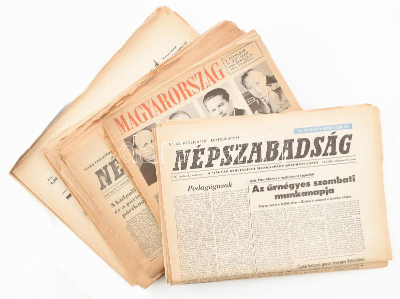 cca 1952-1980 Vegyes újság tétel (Népszabadság, Dunántúli Napló, stb.), benne a kor híreivel: űrhajózás témájú cikkekel (szovjet-magyar űrrepülés, az Apollo-11 holdra szállása), sport és politikai témájú írásokkal, stb. Vegyes állapotban.