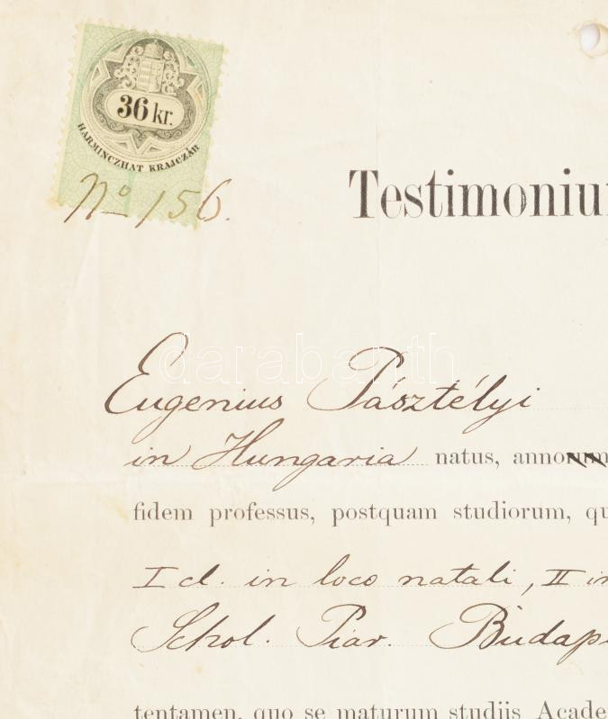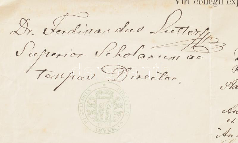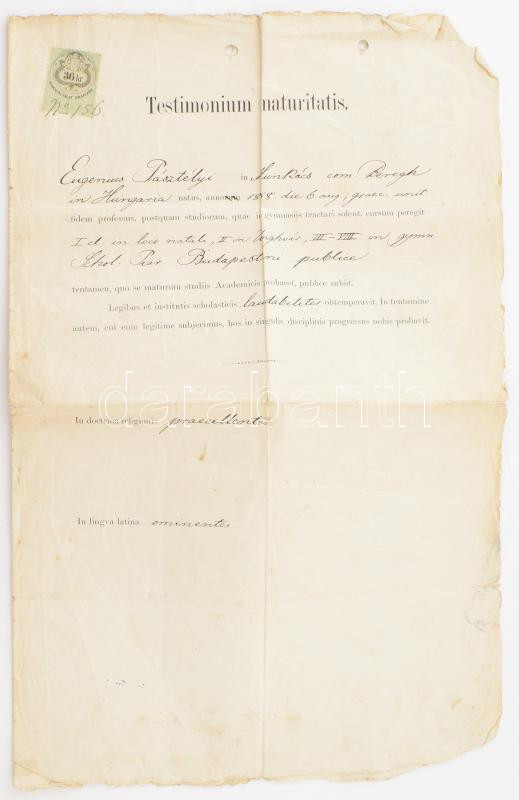 1876 Bp., a Piarista Gimnázium által kiállított, latin nyelvű érettségi bizonyítvány, Lutter Nándor Ferdinánd (1820-1891) budapesti tankerületi vezető, Trautwein János (1819-1893) igazgató, Arányi Béla, Pfeiffer Antal, Kalmár András és Domokos Jenő gimnáziumi tanárok aláírásaival, okmánybélyeggel. Hajtva, kissé sérült, foltos, a lap tetején lyukasztással.